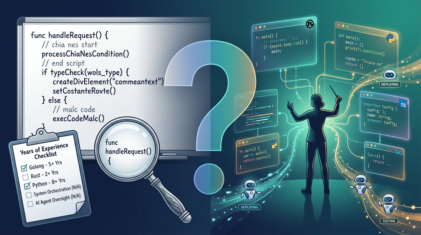 The vast majority of roles I’m applying for are hiring individual contributors with deep fluency in specific languages. Go engineers. Python engineers. TypeScript engineers. The job descriptions read like they were written in 2019—specific framework experience, years with a particular language, maybe a system design round where you whiteboard something on a call.